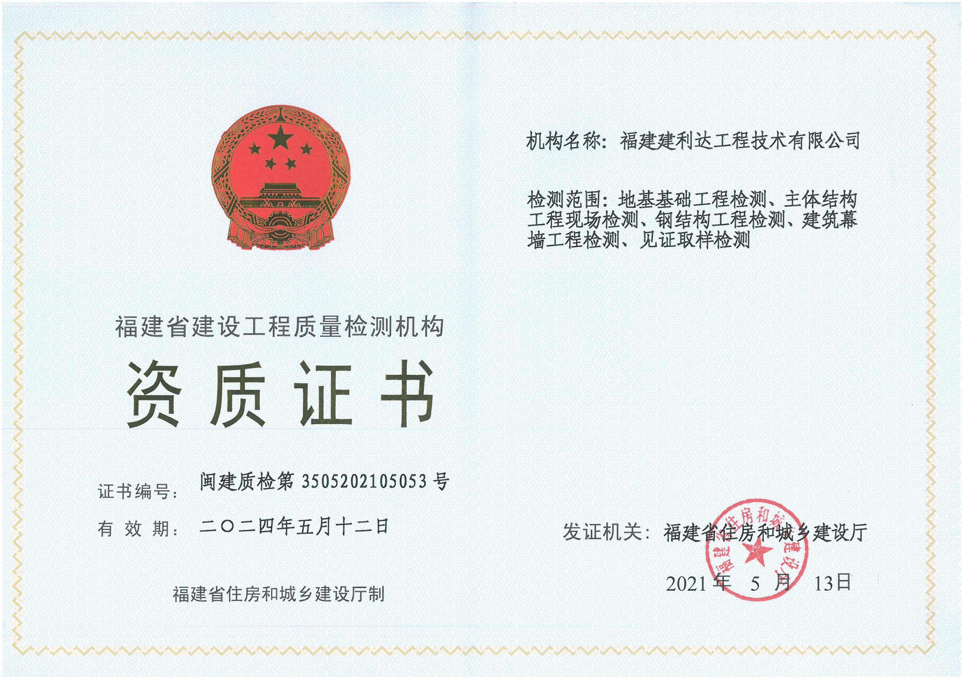 福建省建設(shè)工程質(zhì)量檢測(cè)資質(zhì)證書